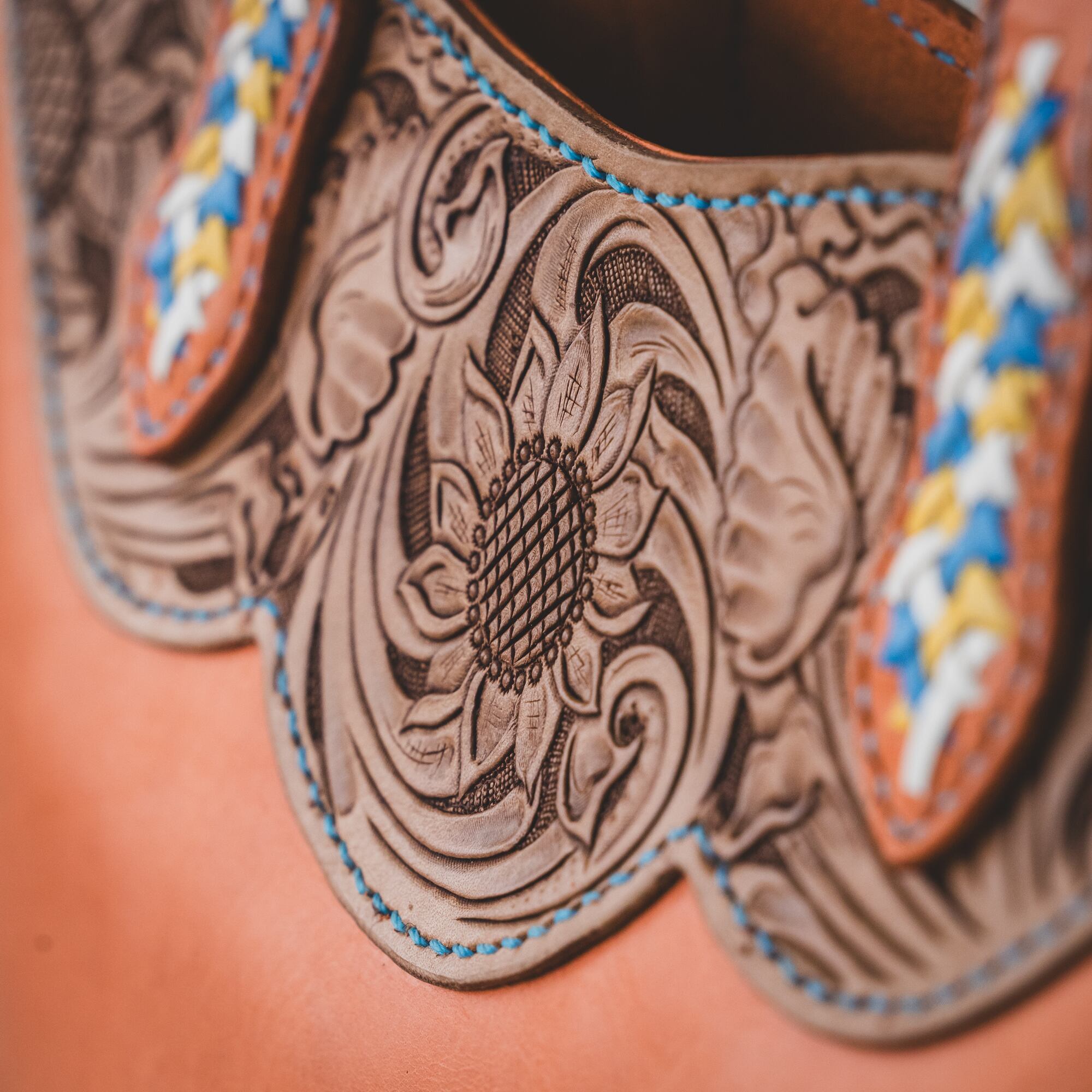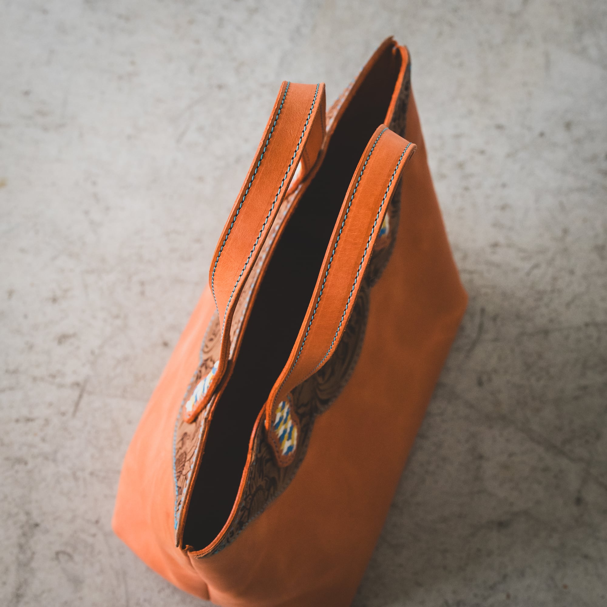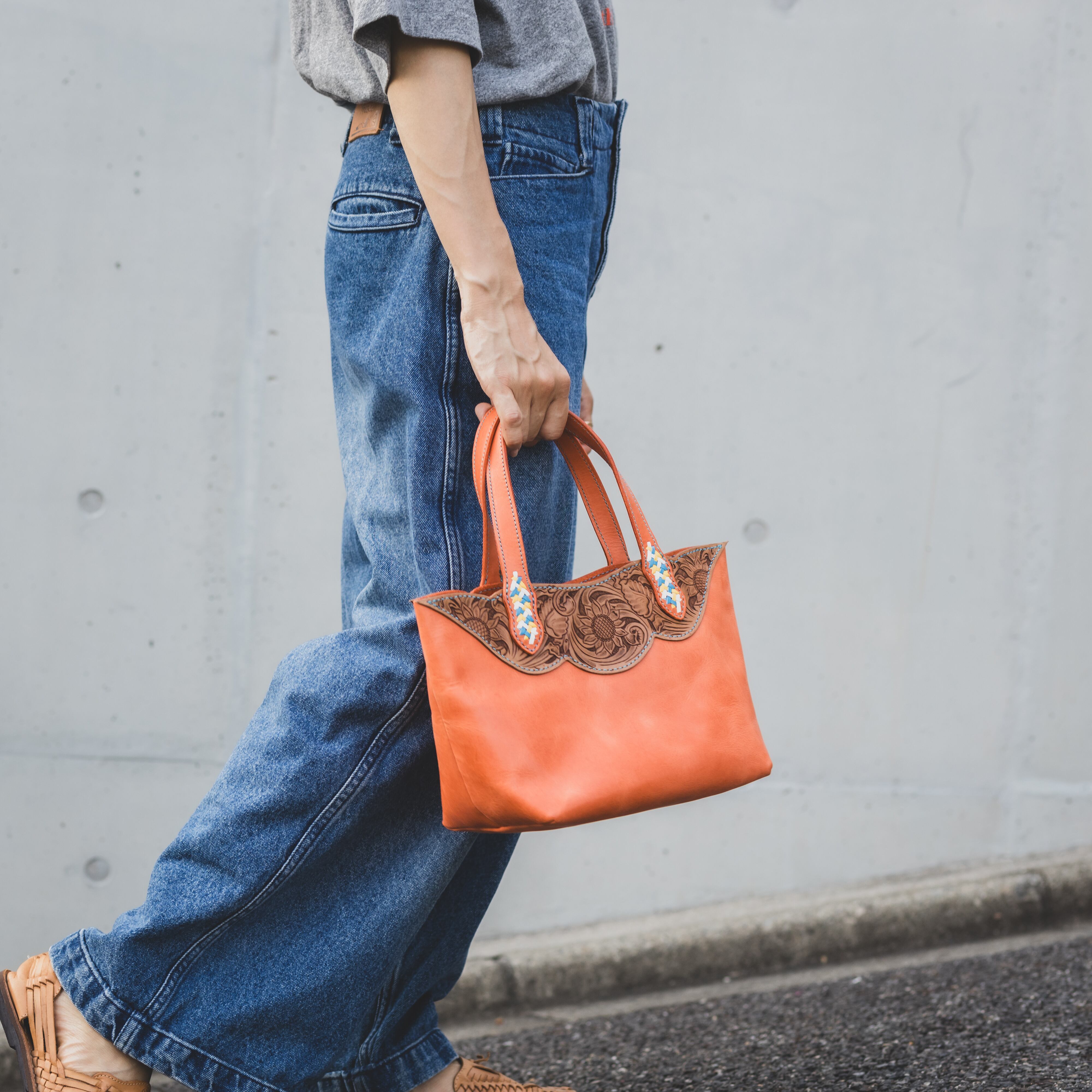 鮮やかな革にカービング(彫る)をあしらったデザインで