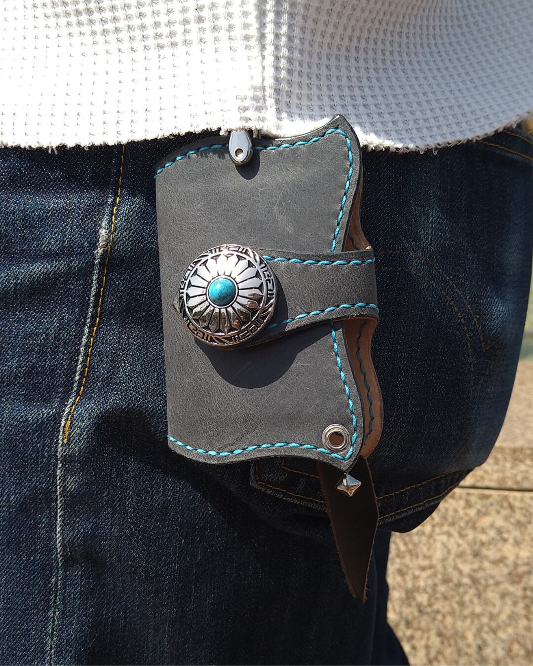 ウエスタン調の形にしたボタン止めのスマートキーケースです。