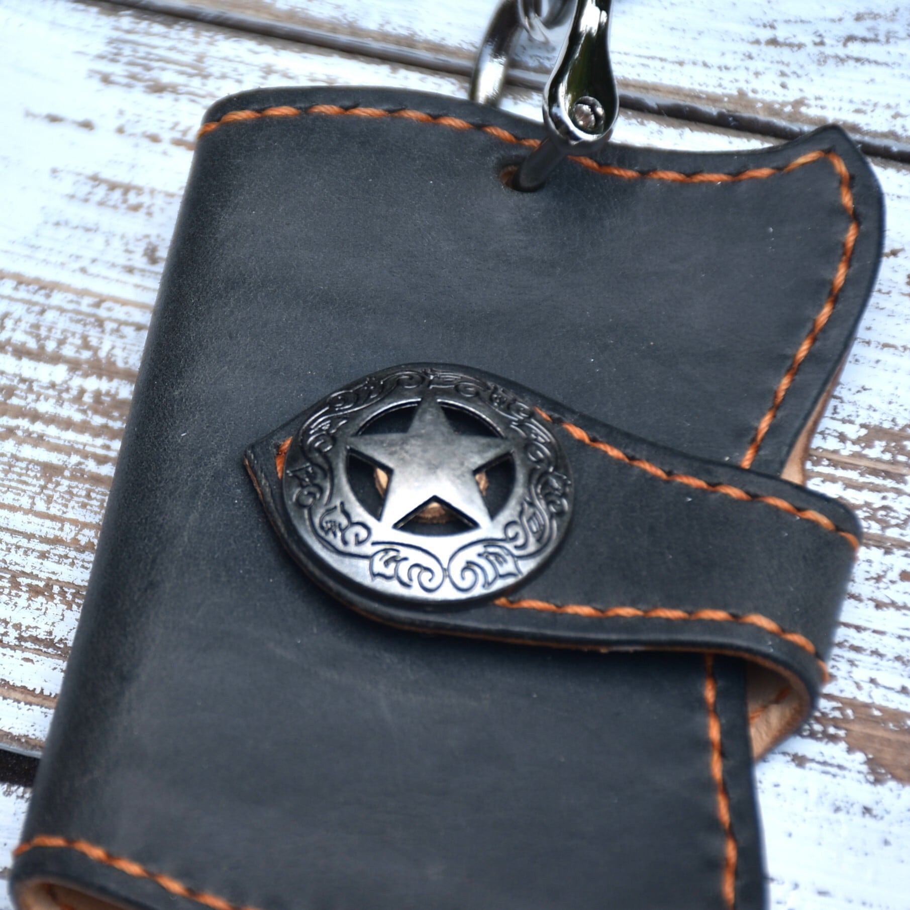 ウエスタン調の形にしたボタン止めのスマートキーケースです。
