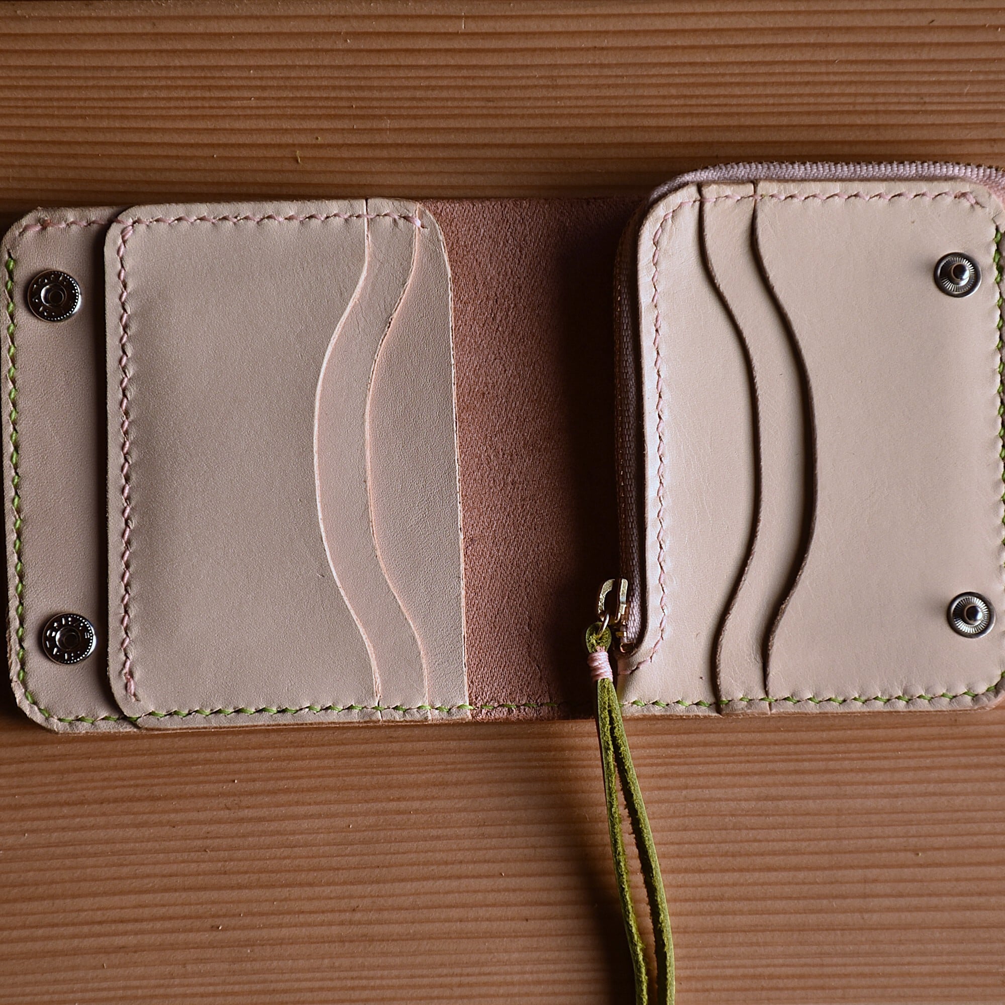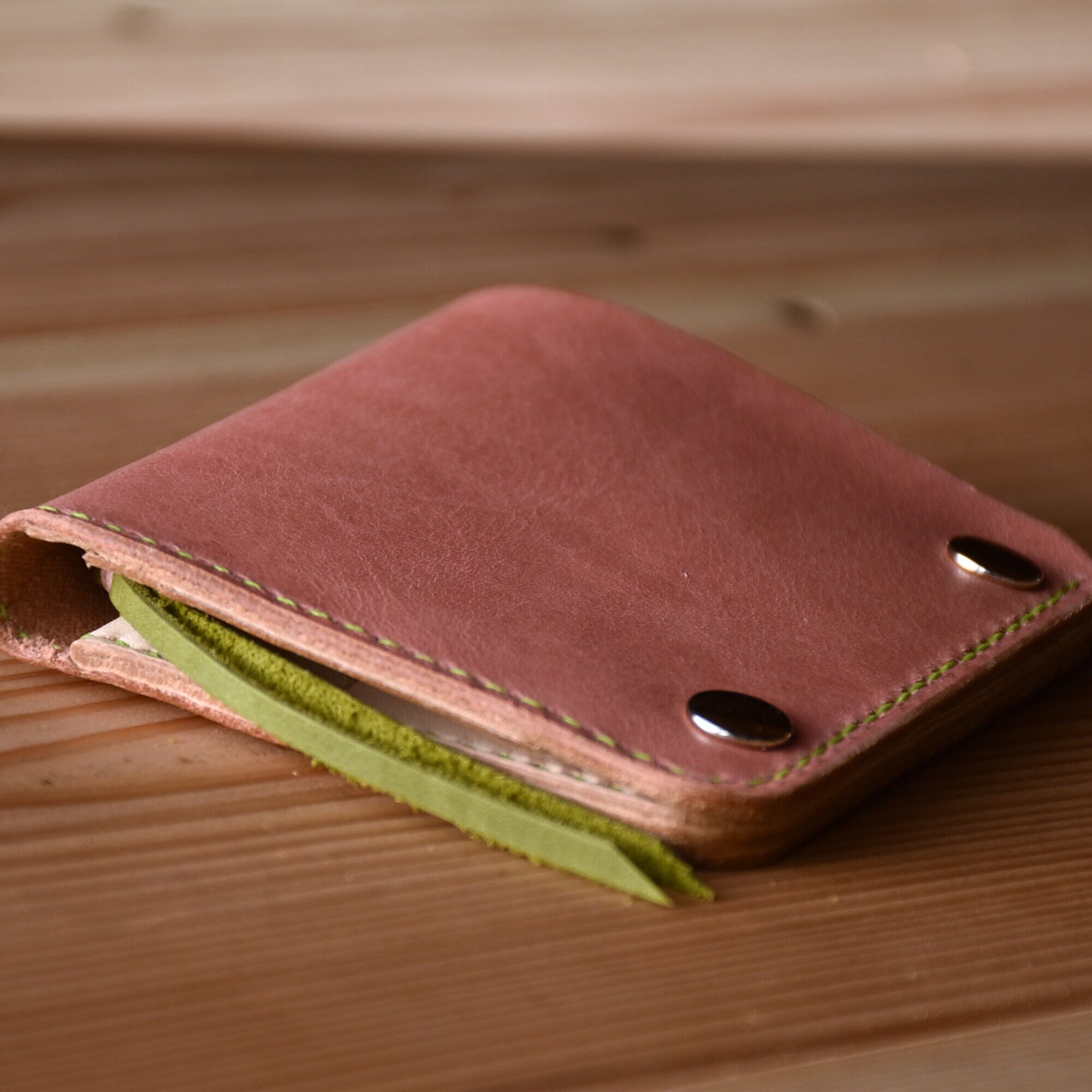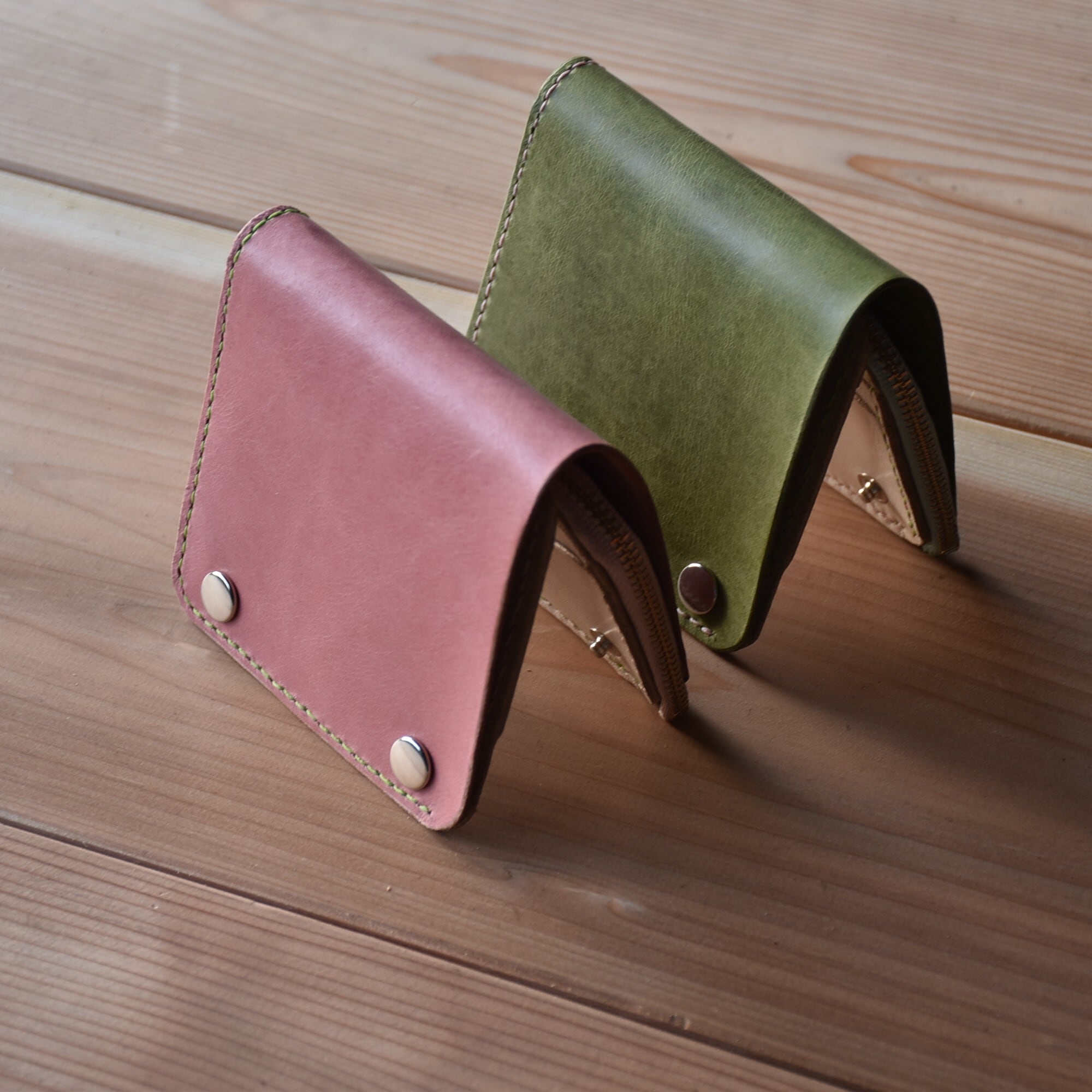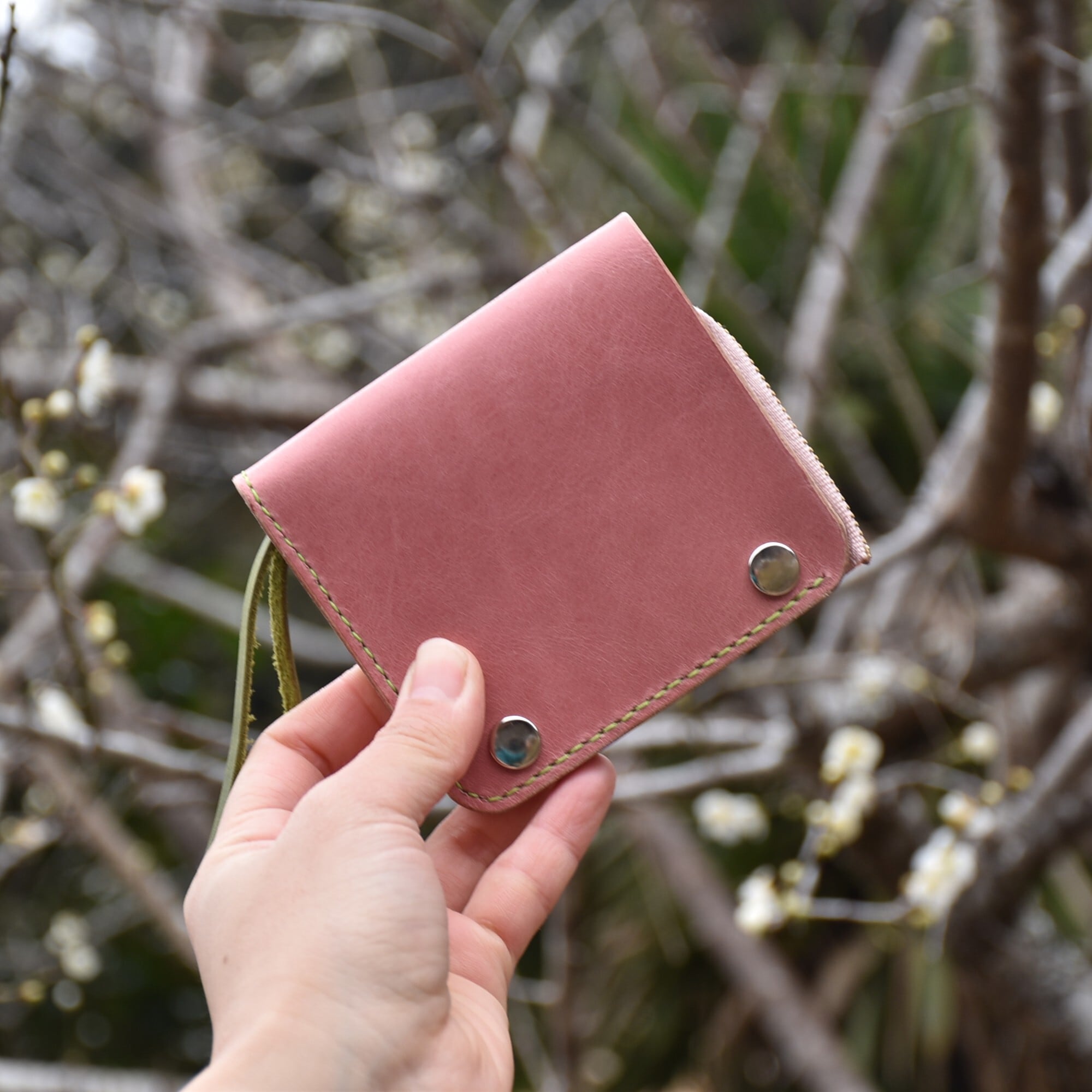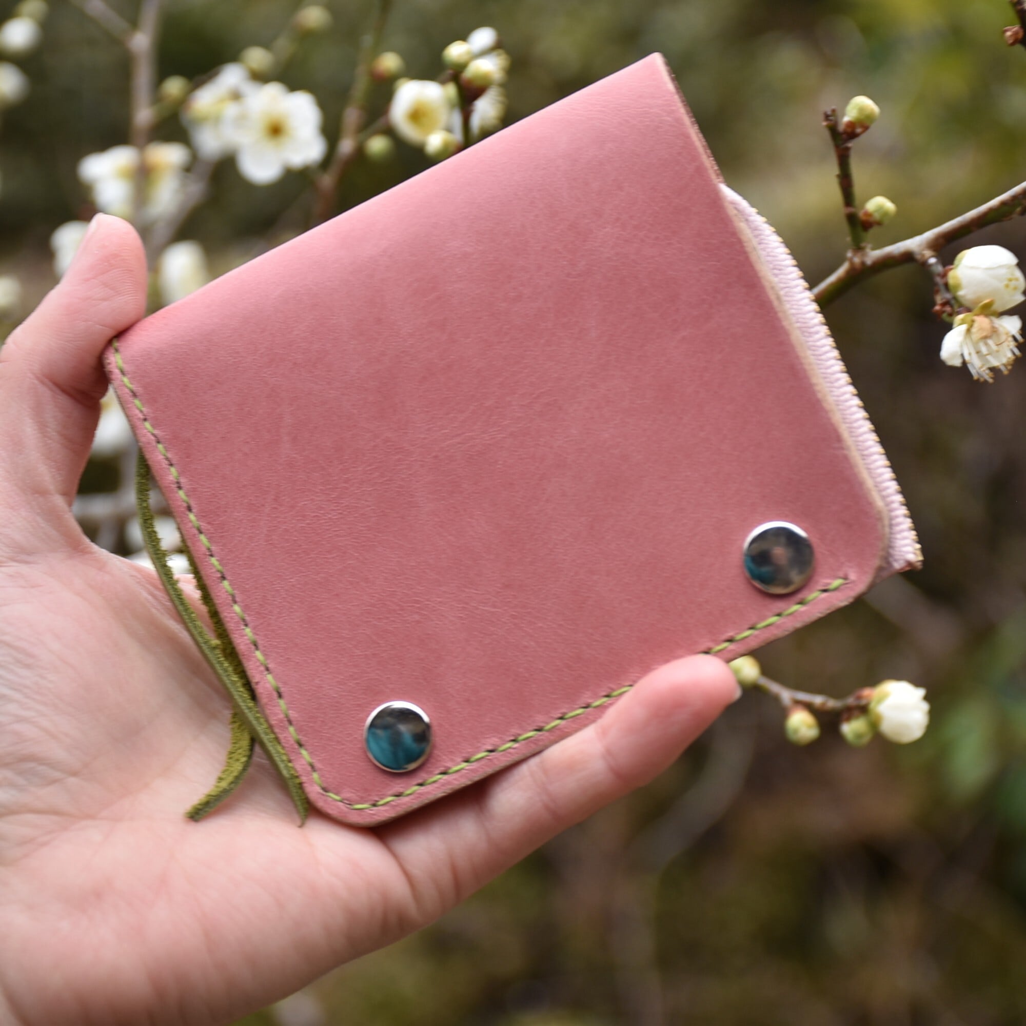 さくら餅 をイメージした ピンク と モスグリーン のコラボ財布です。