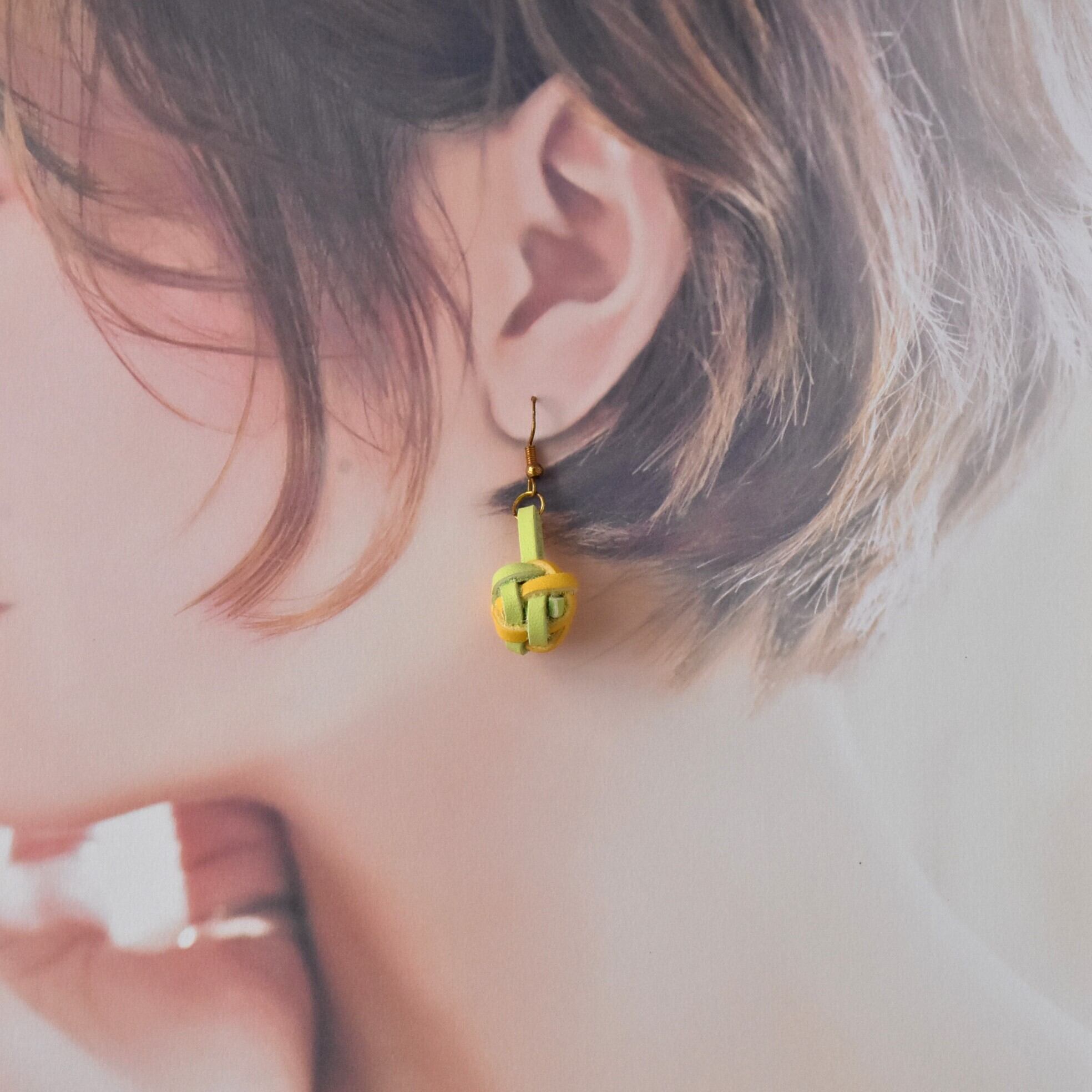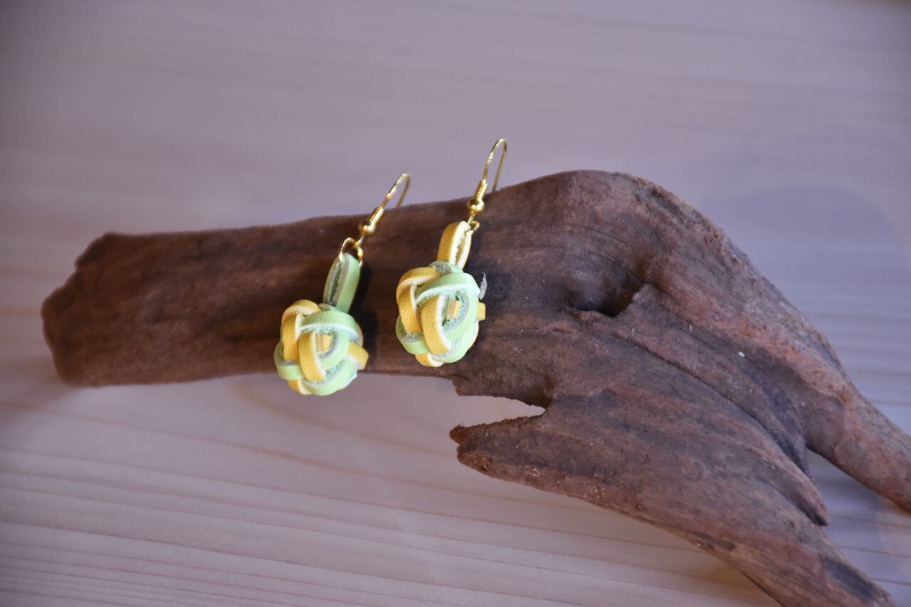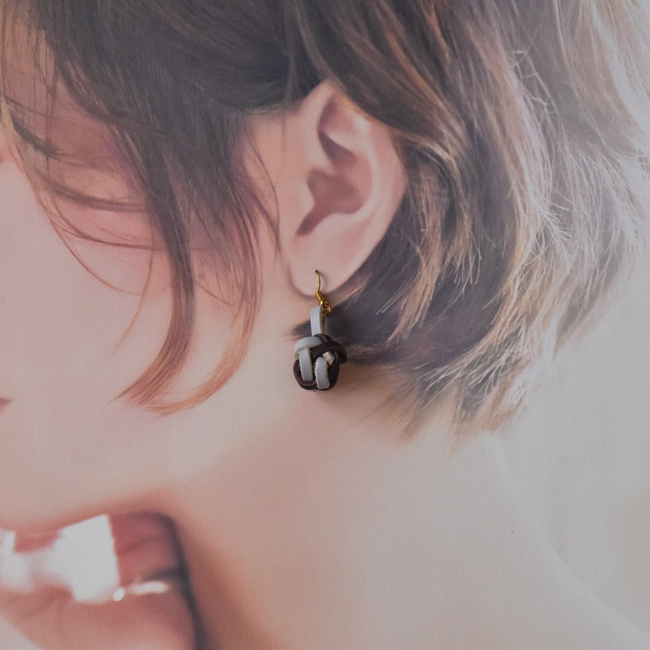 本革レースでひとつひとつ手編みした玉結びのイヤリングです。
