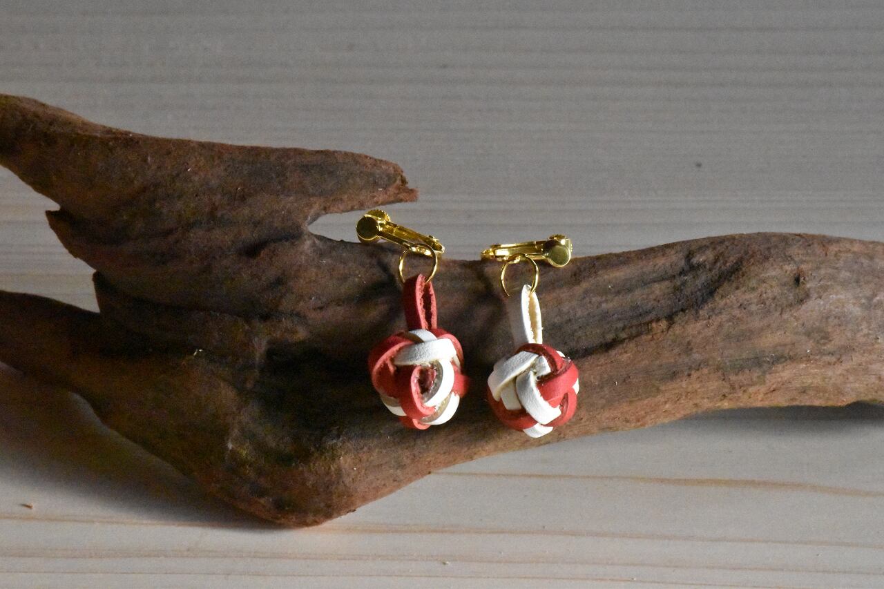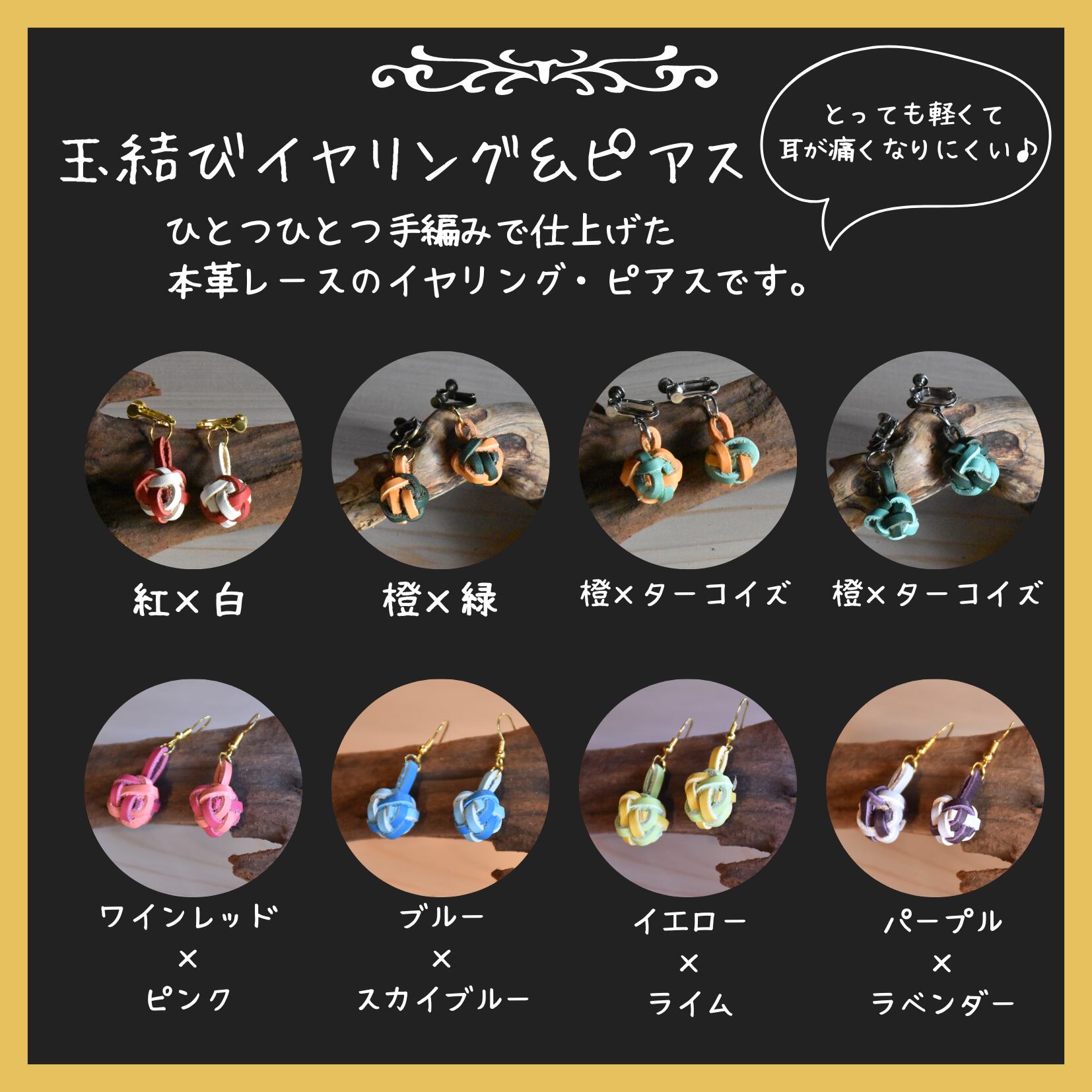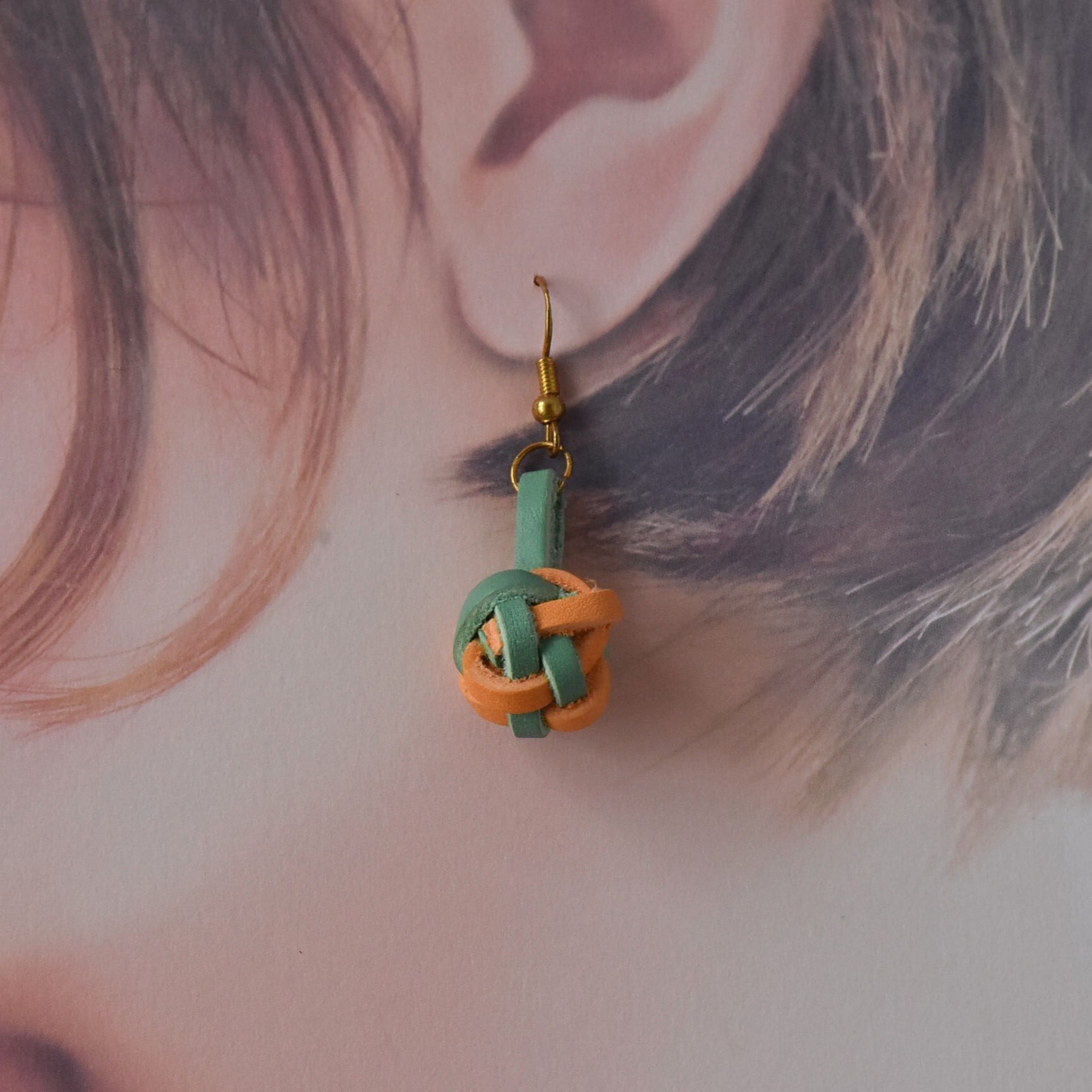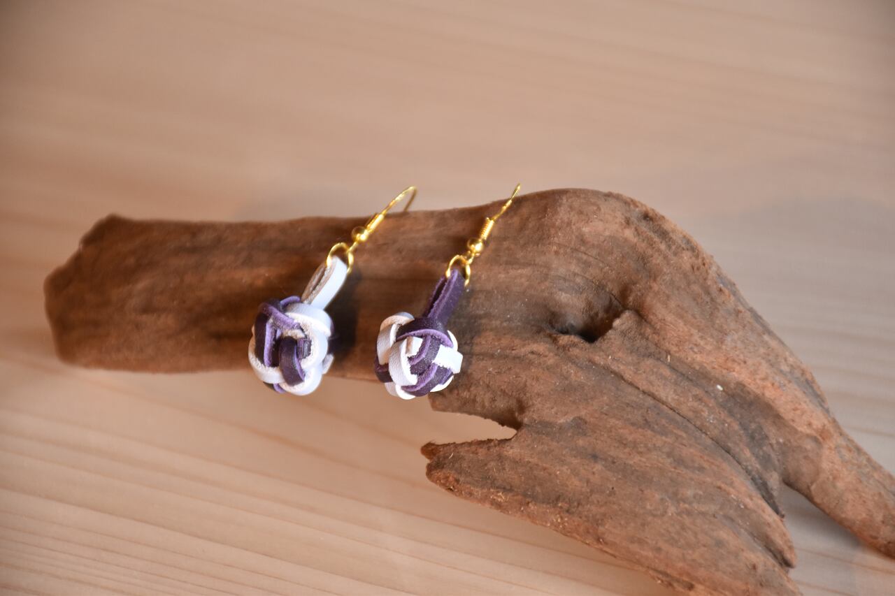 本革レースでひとつひとつ手編みした玉結びのイヤリングです。